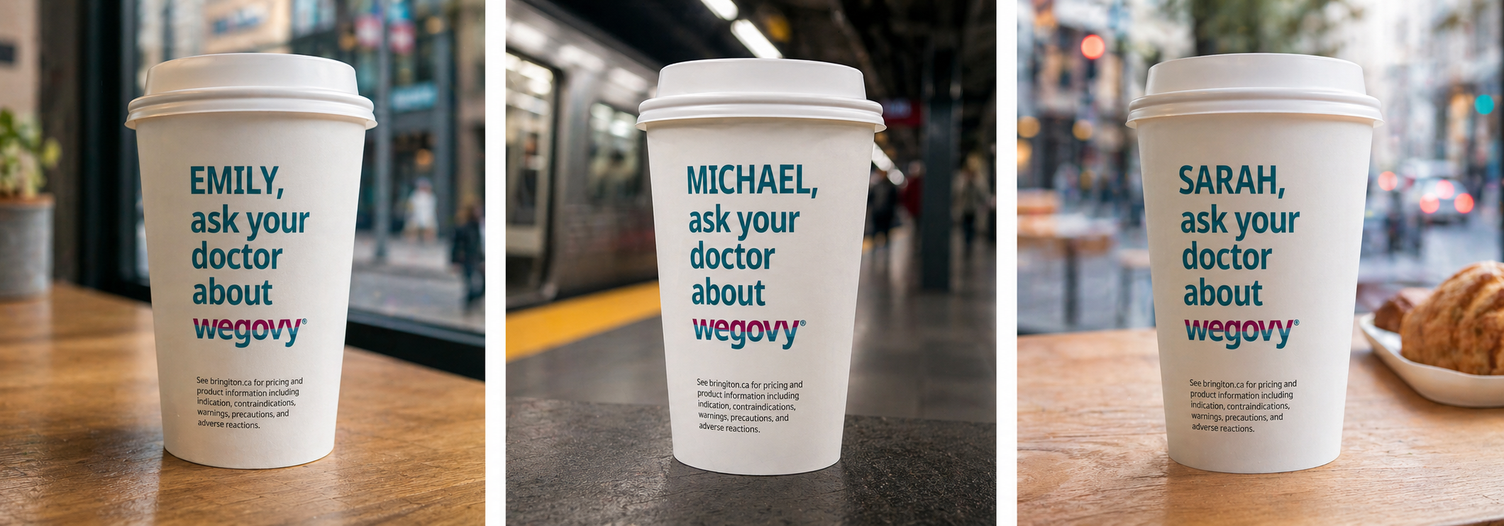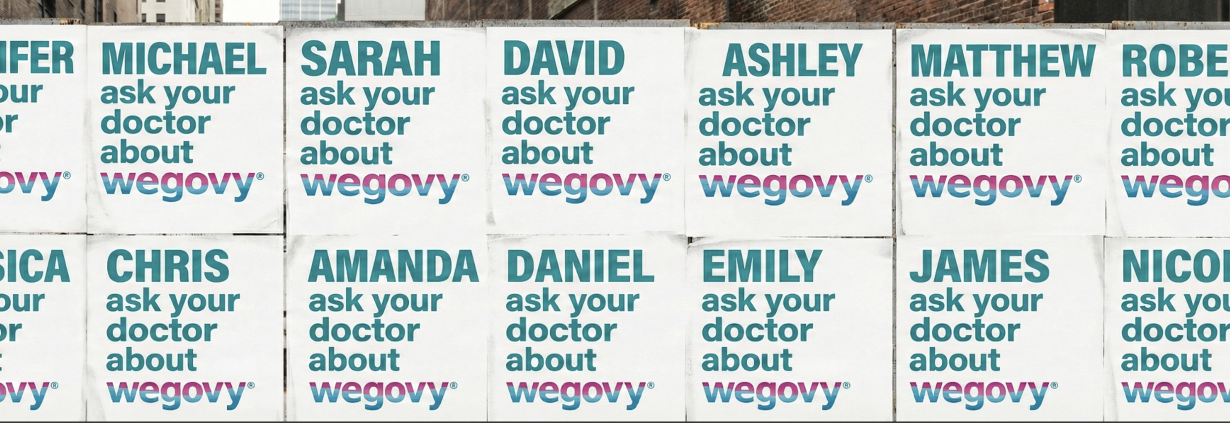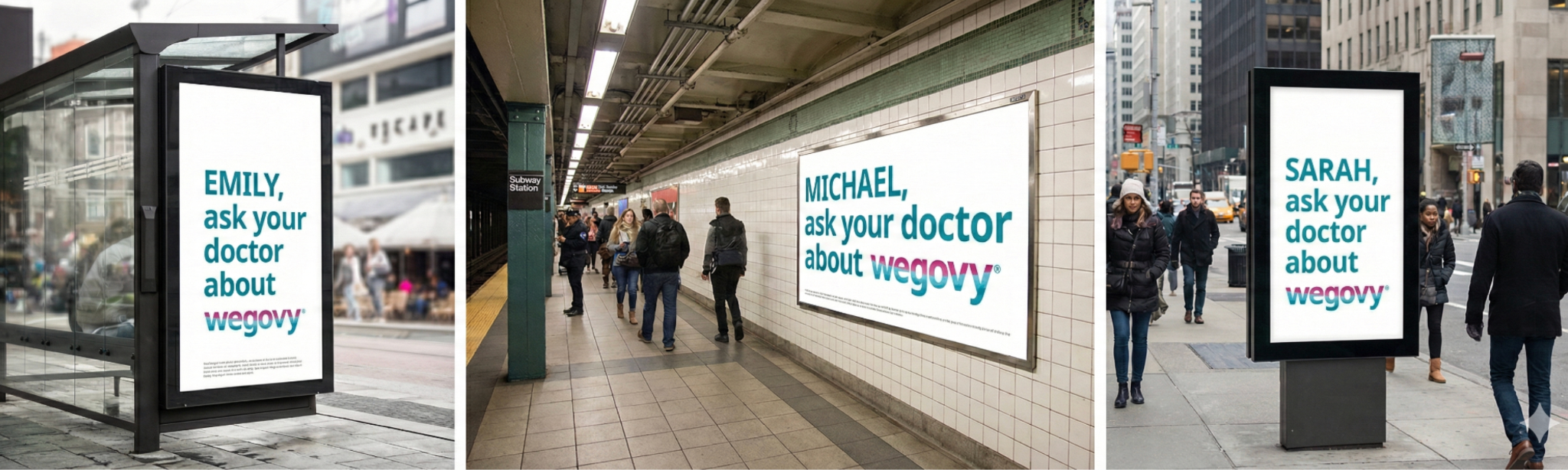 Wegovy isn’t just a weight-loss drug anymore, it’s a cultural phenomenon. To tap into that, we lean on a simple human truth: people tune out generic ads, but instinctively notice their own name. Thousands of stark, hyper-personalized reminder ads turn that into a 1:1 nudge at scale, all while staying PAAB compliant. This was developed as part of a pitch.
